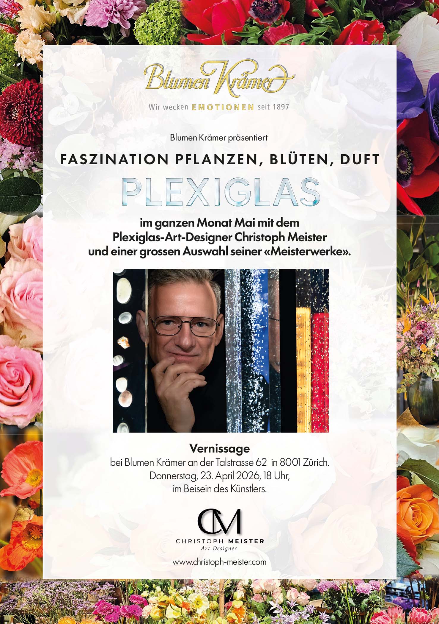 Entdecken Sie einzigartige Plexiglaskunst, die in Verbindung mit Blumen und Pflanzen entstanden ist – eine besondere Symbiose aus Natur und moderner Gestaltung. Die Vernissage findet in unserem Blumengeschäft statt und